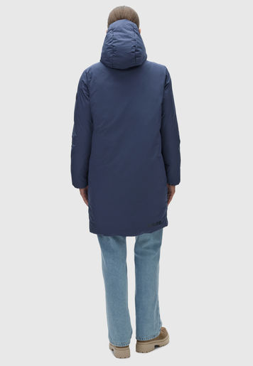 Warm winter coat for women in a modern design. The straight cut, funnel-style neck, and thigh length give an urban and stylish look. Wear it with jeans or knit dresses for versatile winter style.