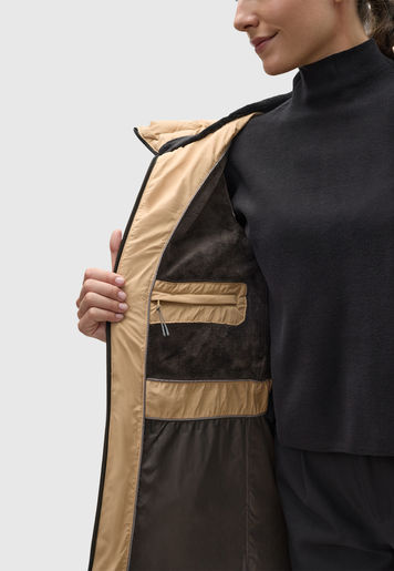 Combining practicality with style, the coat includes two exterior pockets lined with soft fleece to keep your hands warm, with waterproof zippers to secure your valuables. Additional features include warm ribbed cuffs, ample inner and outer pockets for storage, and vegan-friendly polyester down insulation that provides consistent warmth without clumping.