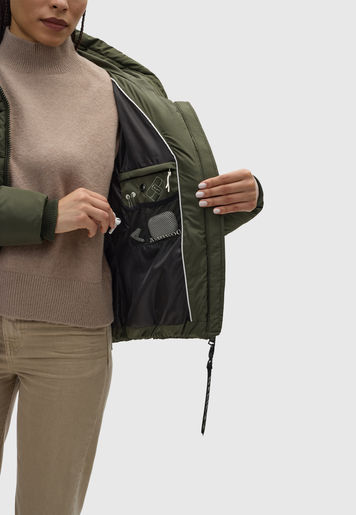 This warm hooded jacket extends over the hips and is cut to be slightly longer in the back than in the front, for extra coverage, freedom of movement, and versatility. Thanks to this tailored cut, it can be easily worn over a thick sweater. The high-closing collar prevents cold wind from entering and will keep your neck warm, even in low temperatures. The adjustable hood offers extra protection and comfort.